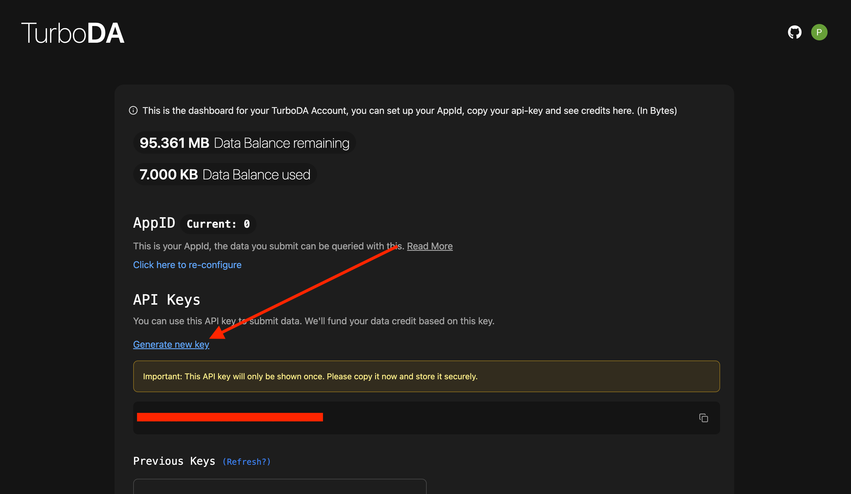 Click on the Generate new key button to generate a new API key.