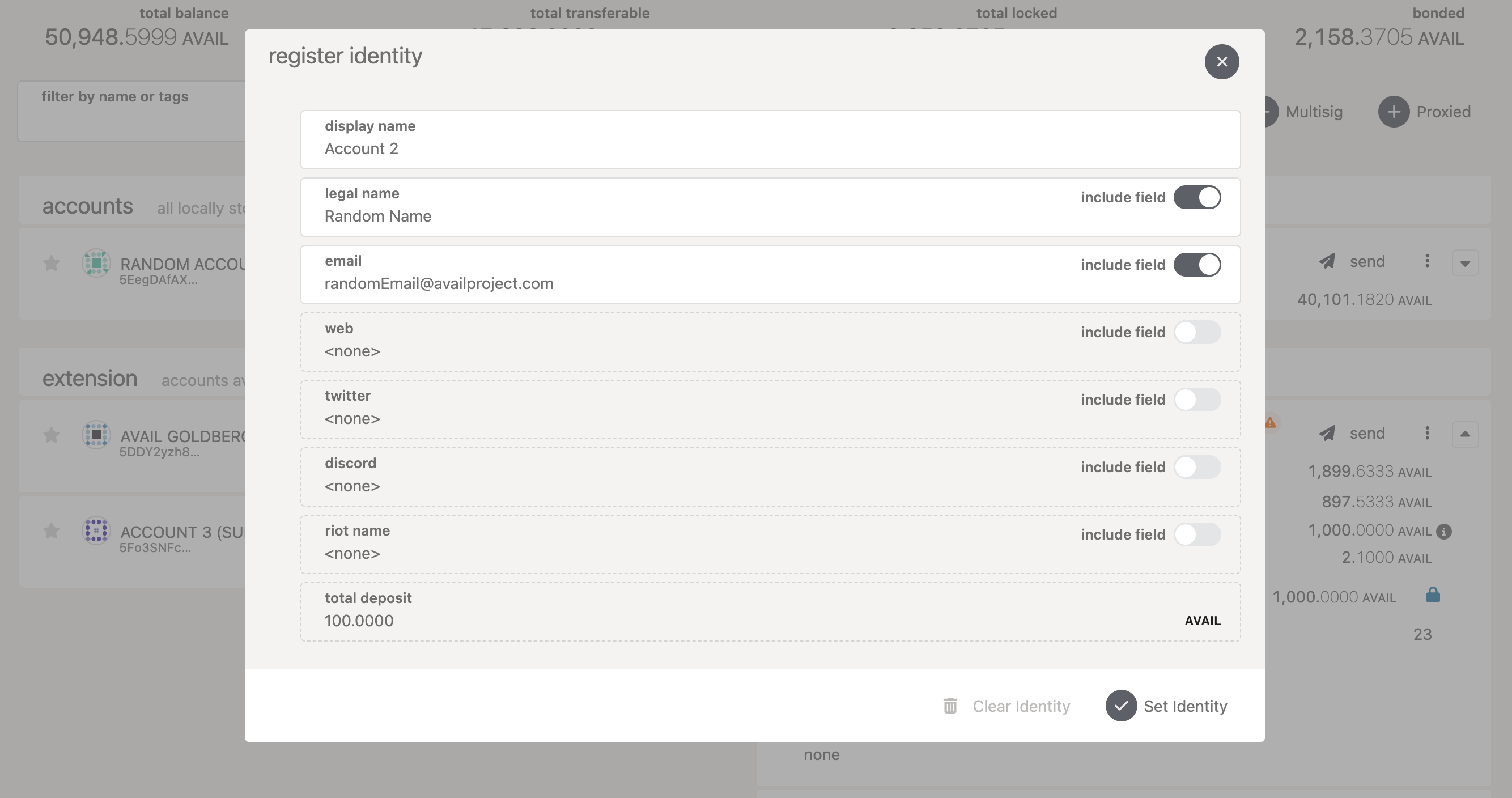 AVAILto set an identity, which is refunded if and when the identity is cleared. - The bond amount for registering an on-chain identity is currently 100 AVAIL.