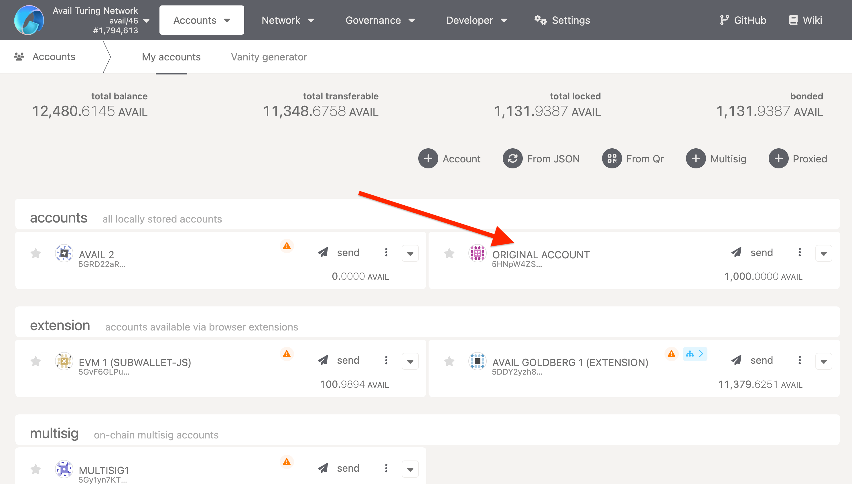 Head on over to the accounts section of the Avail explorer  and connect your main account. In my case, I start out with the highlighted account.