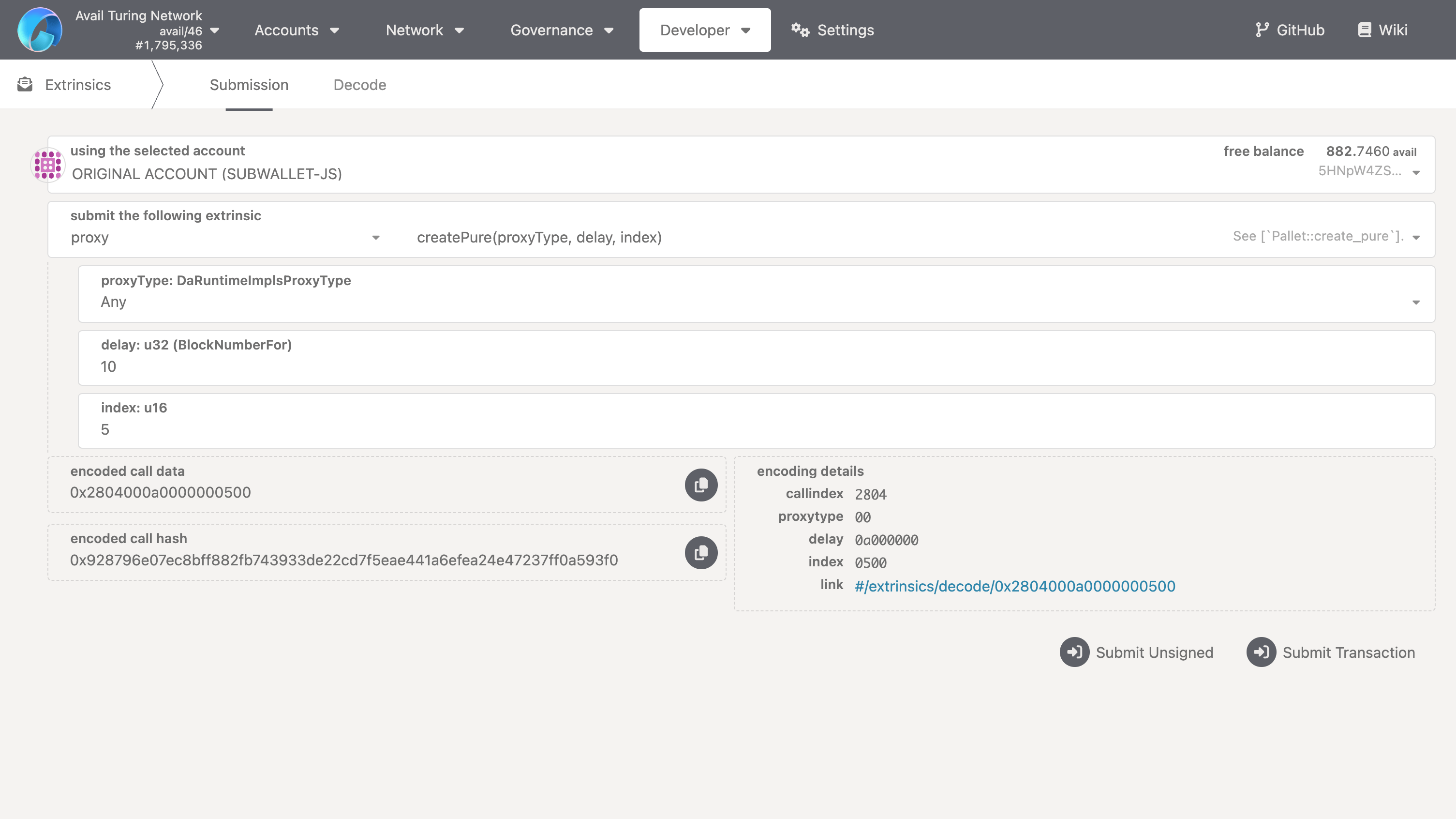 3. Select the createPure extrinsic.